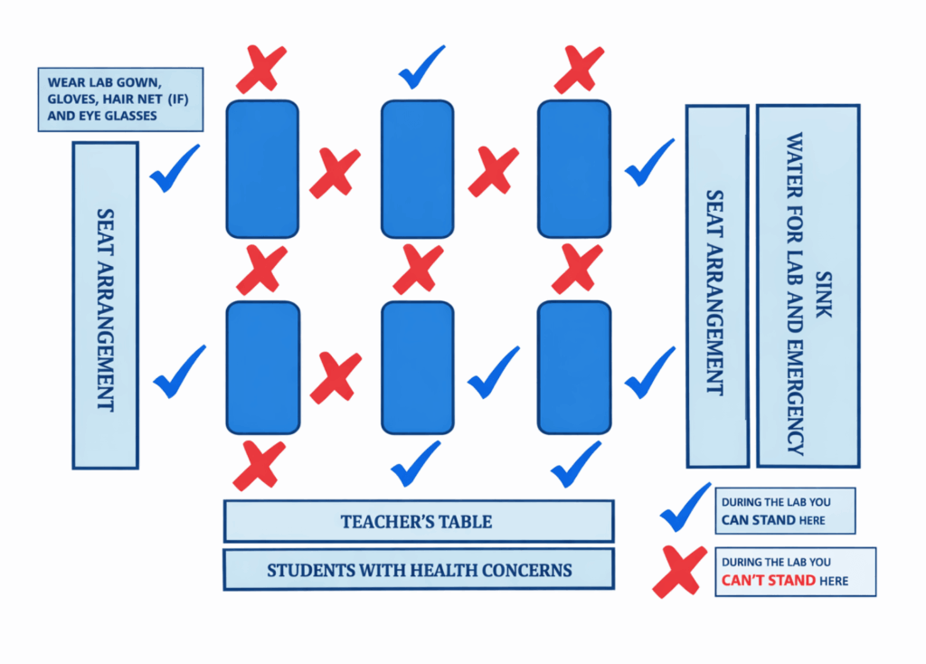 - Ensure all students and instructors are wearing appropriate safety gear, including goggles, gloves, and lab coats.
